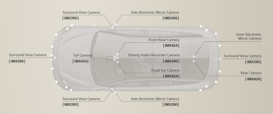 The network of sensors throughout the car enables 360-degree recognition of traffic conditions. The sensors provide precise driving assistance, such as advanced cruise control, self-parking and auto-lane change functions, that corresponds to Level 2+ driver assistance. Software updates allow for continual performance upgrades, with the aim of ultimately achieving Level 4 or higher self-driving in the future.